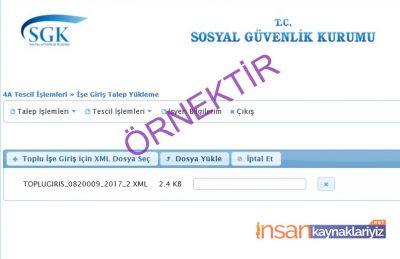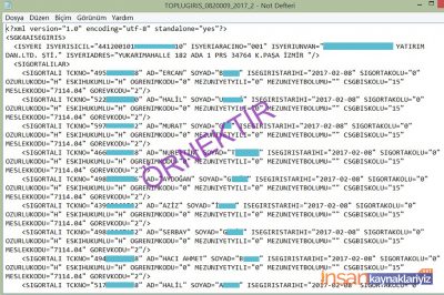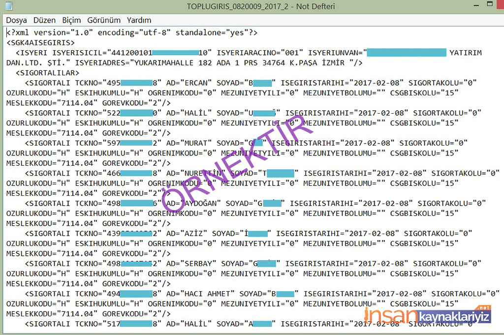 1 – İlk olarak toplu işe giriş ve ayrılış işlemlerini yapmamız için işyerinde kullandığımız program aracılığıyla işe giriş ya da işten ayrılış için toplu olarak “XML” dosyasını hazırlıyoruz. Bu dosya SGK sitesi için yazı formatında hazırlanır ve SGK sistemine uyumlu olarak düzenlenir. XML Dosyası E-Bildirge için düzenlenen formatın aynısıdır. Tabi bu dosyayı elle yazmak bir hayli zor. Yine de bilenler varsa yazabilirler. Eğer bu dosya programınızda yoksa ya da düzenlemeyi bilmiyorsanız Personel/İnsan Kaynakları program yöneticinize başvurun. Örnek XML dosyası aşağıdadır.