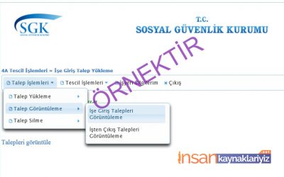 7 – Toplu işe giriş işlemleri için SGK Sistemine ön yükleme yaptık. Ancak henüz onaylanmadı. Onaylamak için yeniden sol üst tarafta yazan “Talep İşlemleri” ni tıklıyoruz. Talep Görüntüleme” dedikten sonra “İşe Giriş Talepleri Görüntüleme” ye tıklıyoruz.