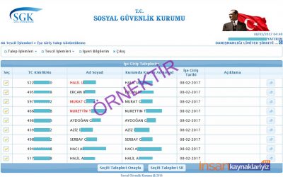 8 – Karşımıza XML dosyasında hazırladığımız toplu işe giriş işlemleri geldi. Son olarak hemen çalışan isimlerinin en sağındaki pencereye tıklayarak kontrol edebiliyoruz. Aşağıda yazan “Seçili Talepleri Onayla” dedikten sonra işlemimiz tamamlanmıştır. PDF formatında kaydedebilir ve çıktı alabilirsiniz.